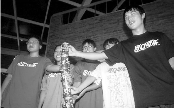 颁奖典礼中,浙江艺术职业技术学院学生袁幼兰成为我省首位可口可乐奥运会火炬手,她和其他四位在本次活动中表现最突出的环保志愿者,分别手执印有贝贝晶晶欢欢迎迎妮妮的福娃形象可乐瓶,当他们将五瓶可口可乐拼接成火炬造型时,全场响起了热烈的掌声。