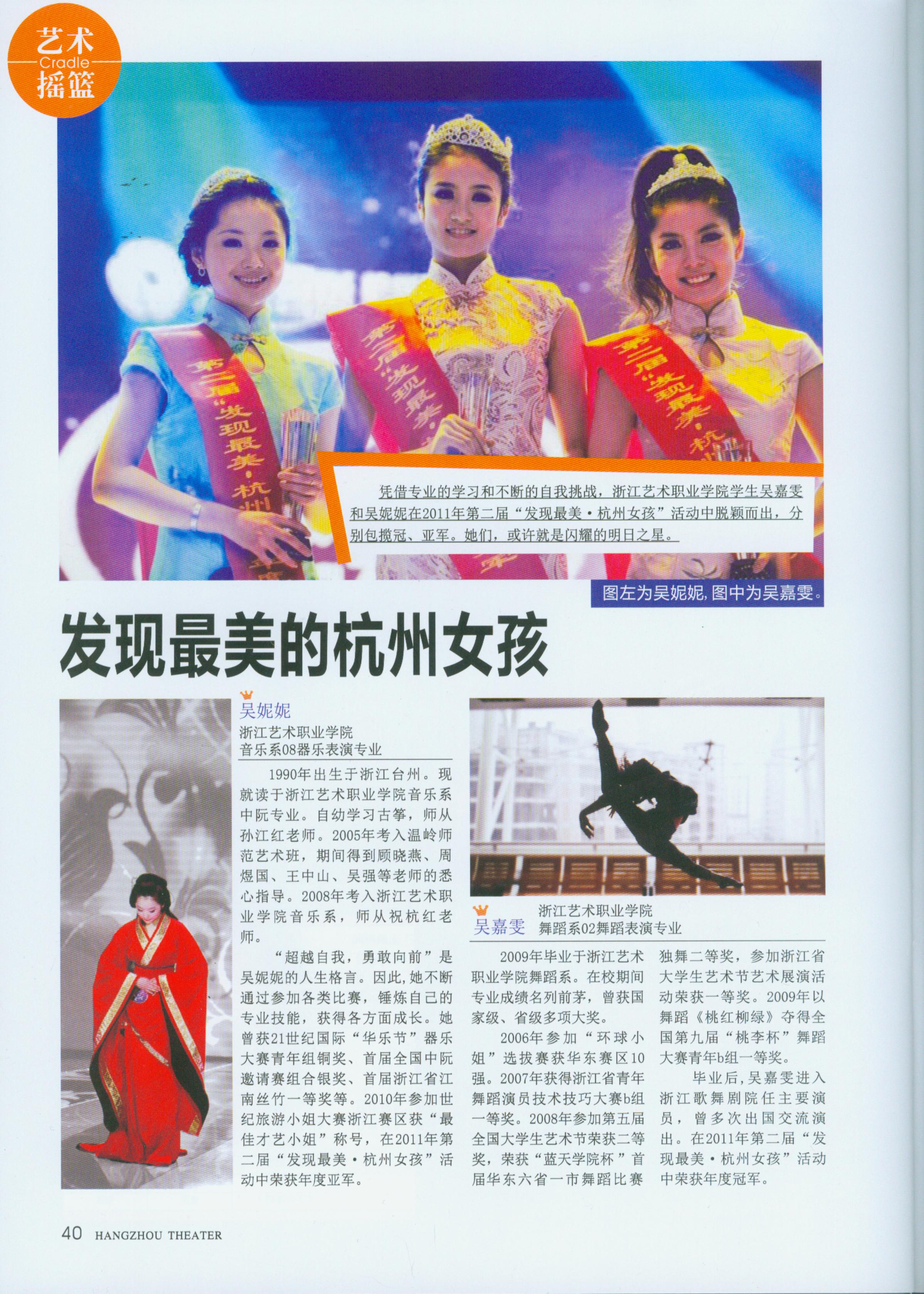 毕业后,吴佳雯进入浙江歌舞剧院任主要演员,曾多次出访国外交流演出。在2011第二届“发现最美·杭州女孩”活动中荣获年度冠军。