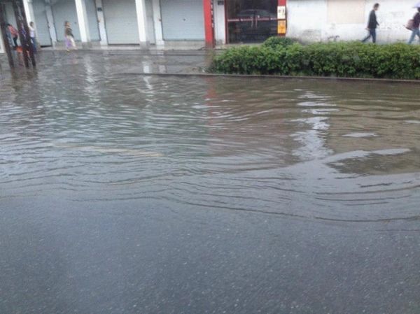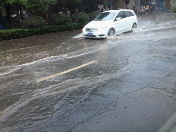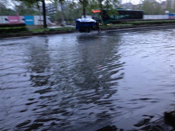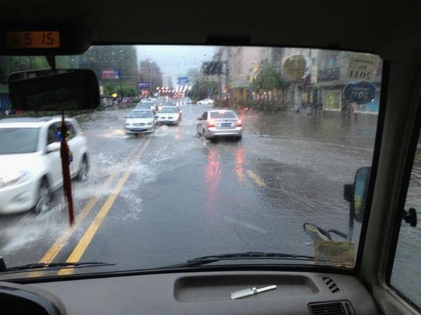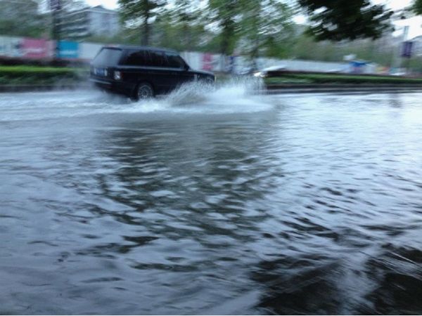 远远的已经能看到我们的下车点,可今天是怎么也进不去了。站点已被大水吞没了,边上还拉起了醒目的警戒线,提醒这里的积水不是一般的深。我只好提前一站跳下车,呆呆地看着平坦的马路成了“一条大河波浪宽”,真有些奇怪的感觉,似梦非梦。这时一辆越野车狂飚朝前冲去,掀起水漫金山的巨浪。