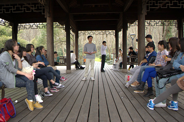 图一:浙艺院第十届记者团文学部第一次会议,在西湖赵之谦纪念亭召开,这里青山绿水围绕。