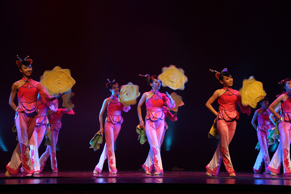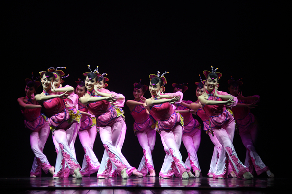 整台晚会,每个节目都出自大三下半学期的新剧目。 中,女子群舞《蝴蝶飞》难度最大,全部由手绢花技巧组成。对于沈阳的女孩子们来说,手绢花技巧简直就是小菜一碟,因为这是她们从小玩到大的玩具啊!但是对于我们江南女子来讲,从刚开始的右手单手转起花到五十个为单位的转,再到左手也练习得像右手一样然后双手一起转花,最后双人对面抛接。从九月开学到毕业汇报前,手绢花陪伴着我们度过每一天。熬夜、通宵已是家常便饭。