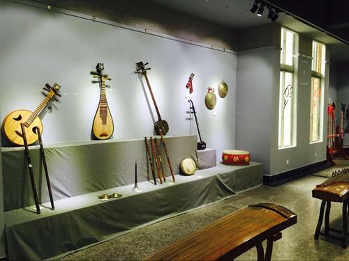往里走,古筝、古琴、琵琶、二胡、唢呐、萧、锣鼓等摆放的错落有致,禁不住摸了摸古筝,拨动了它的琴弦,哟!这音色!可真有味道啊!