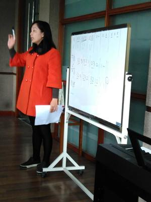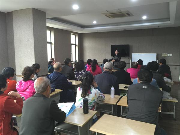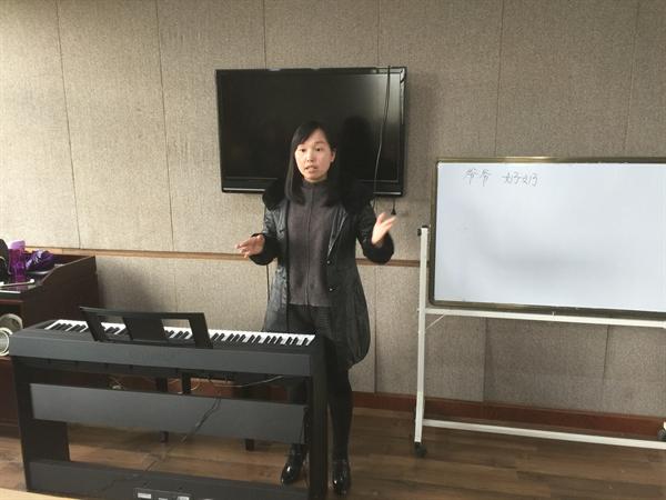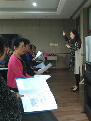 在西浦社区为老人们授课已有将近两年的时间,每个周末半天课,姜晓桃和社区老人们都成了朋友,她说,这些学生都是退休后的中老年人,虽然几乎是零基础,但是都非常用心地学习合唱,那种劲头和精神令她很感动,从而就有了源源不断把声乐知识传授给社区老人的动力。因为是老年人,接受能力有限,所以姜晓桃一般从先矫正音准开始,先传授两个声部的唱法,循序渐进地练习另外两个声部的唱法。耐心细致、循循善诱的授课,丰富了社区老人们退休后的精神文化生活,让许多老人在退休后近距离地接触音乐、爱上音乐。一位很喜欢唱歌的学员有一次把自己的老母亲也带到课堂上旁听,老人家听得非常认真,把每个知识点都记下来,后来每个星期都会来听。有一次姜晓桃生病停课,这位老人就打电话问候,说很喜欢上课,希望老师能早日康复回去上课。姜晓桃认为,老人们大都没有声乐基础,但同时每个人的具体情况又各不相同,为这样的学习群体授课,既要针对性地辅导,还要不断总结不同老人的学习状况和更新自己的知识结构,提高自己的音乐水平。