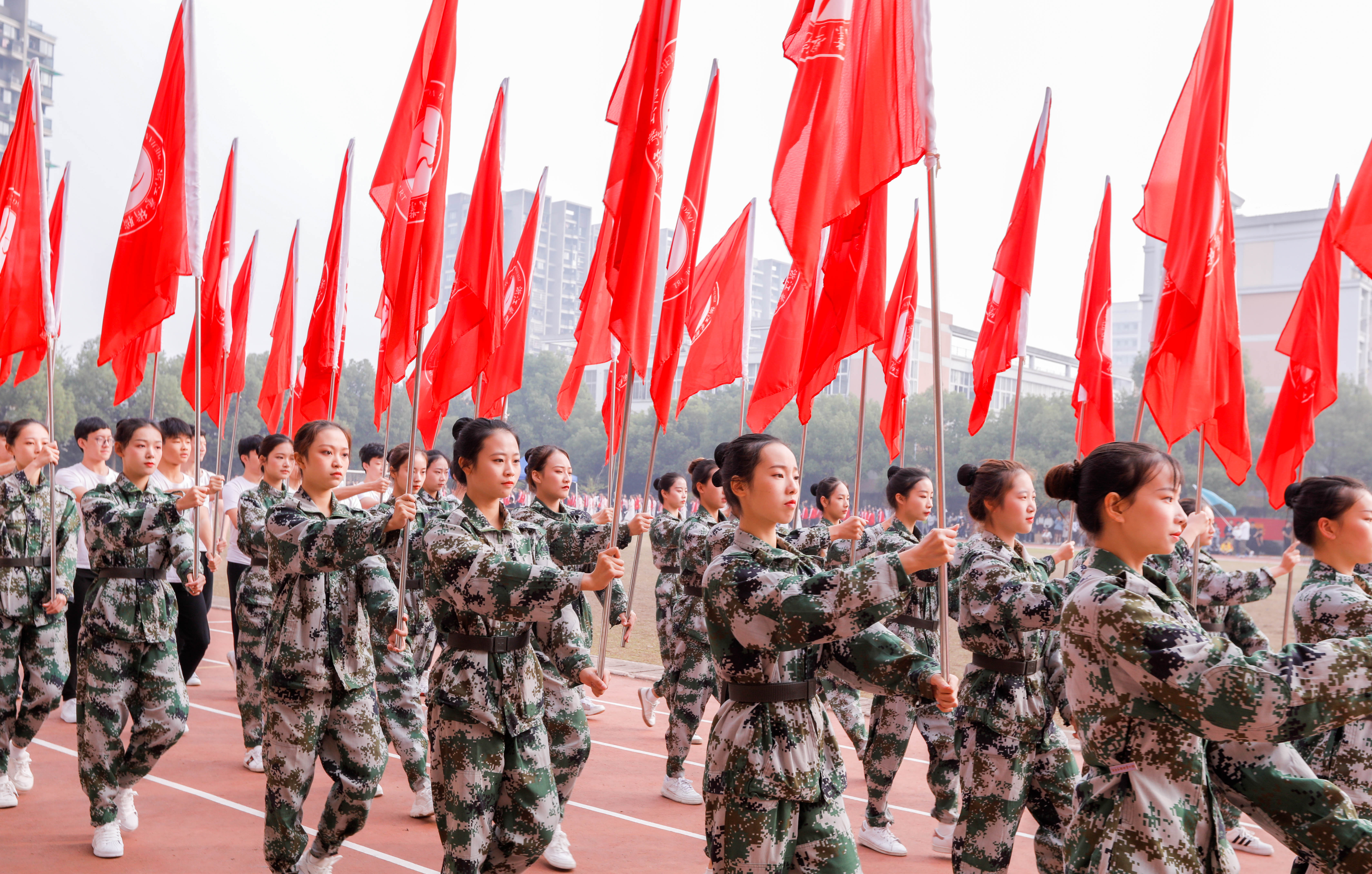 在各系团体操比赛中,各系同学“各显神通”,将艺术体操与优秀传统文化相融合,将红旗、绢扇、彩带、气球融入舞蹈,或刚强活泼,或柔美含蓄。影视技术系以“影”为主题的太极拳舞标新立异,不仅紧扣本系特色,更让人联想到张艺谋导演的《影》中别具一格的水墨中国风,其中太极八卦图上的对武该是本次学子表演灵感的来源。音乐系用青春洋溢的舞蹈,整齐划一的动作,表现他们独一无二的风采。文化管理系的音乐配合同学们的神采飞扬,激情四射。美术系放飞的气球和随风飘扬的国旗颇具视觉冲击力,仿佛那放飞的不仅仅是气球,更是一种希望。戏剧系从一开始的海浪翻涌到后来的红旗飞扬,给了我们一场视觉盛宴。舞蹈系同学们身着水墨色的舞裙,手持精致扇子,用扇舞表现了舞蹈的柔美与华丽。