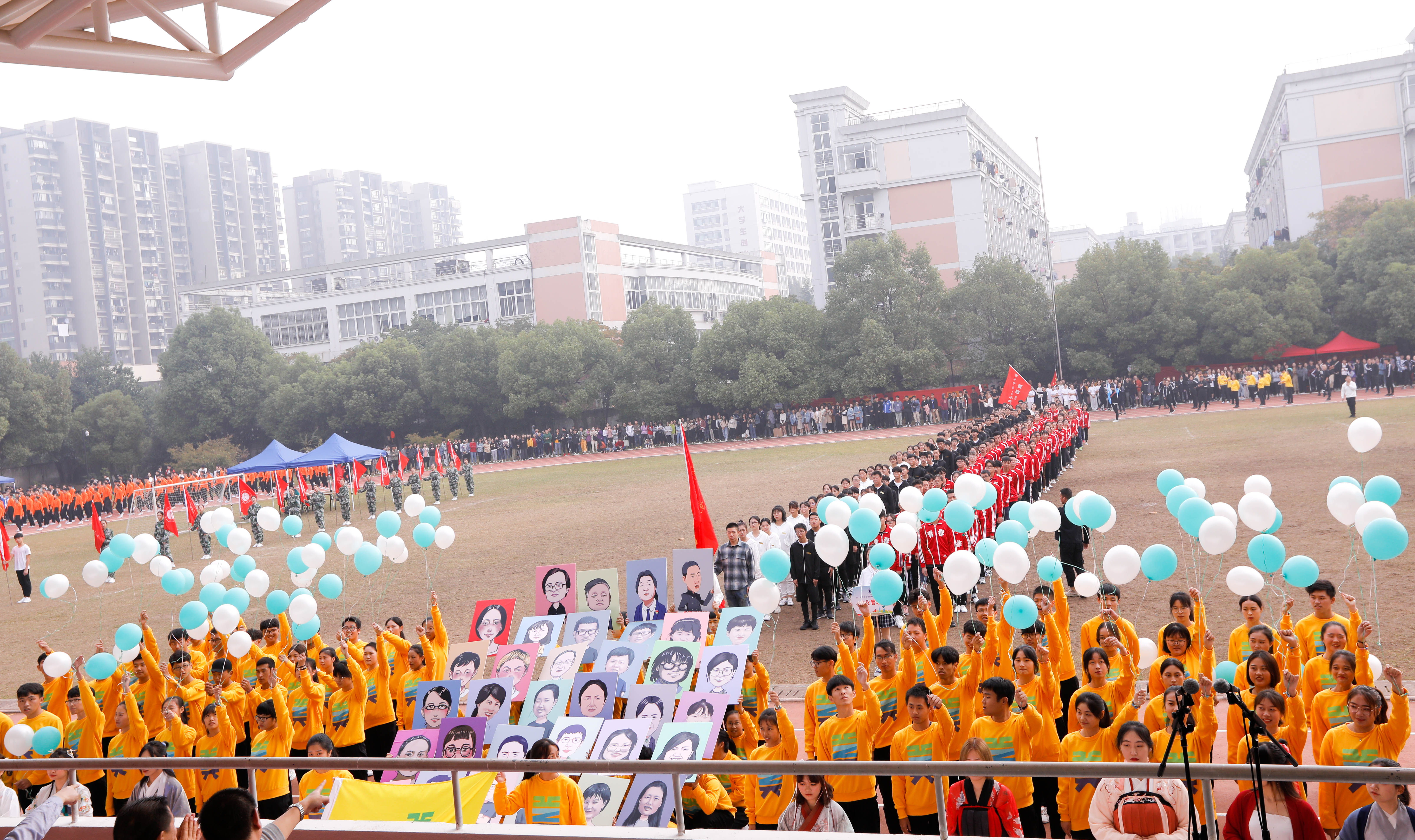 在充满激情的运动员进行曲中,由各系师生组成的代表团迈着整齐一致的步伐迈入田径场,诠释着“全民全运”的魅力。各系的入场表演精彩纷呈,各有特色,美术系的汉服秀彰显中华传统服饰的特色文化,文化管理系的打伞舞将江南女子的温婉气质展现得淋漓尽致,戏剧系、舞蹈系自信展示优雅舞姿,影视技术系以啦啦操舞为赛场增添活力,音乐系同学手上的气球诉说着放飞理想的青春朝气。江南忆,最忆是浙艺,天公作美碧空现,骄儿洒汗壮志酬。