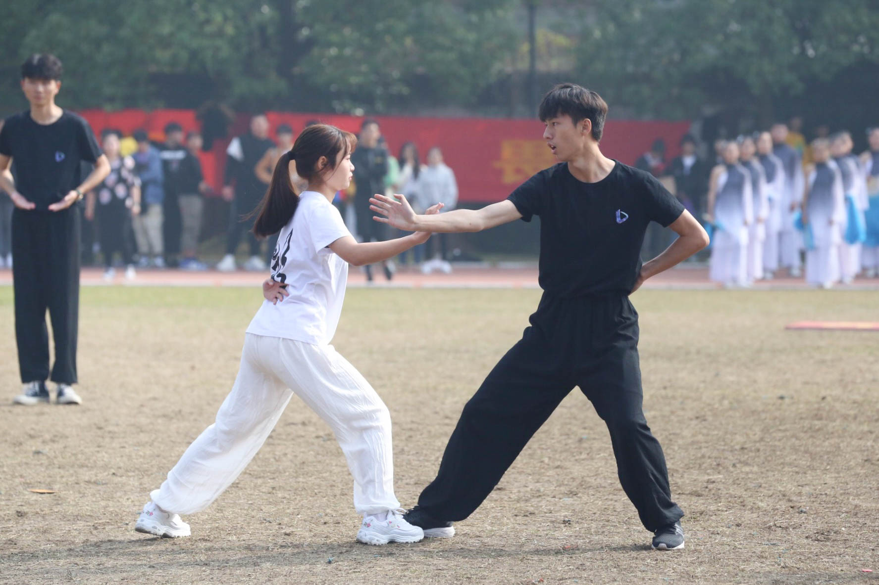 2017级戏剧影视表演班学生俞俊、马佳红老师分别代表运动员和裁判员宣誓。校党委书记朱海闵宣布浙艺第15届田径运动会正式开始。
