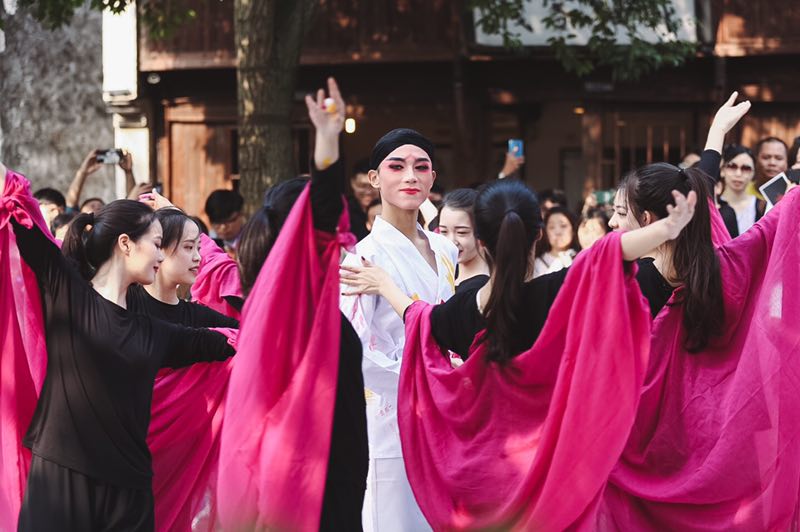 为了本届乌镇戏剧节“古镇嘉年华”的演出,戏剧系17表演艺术班的20位同学从暑假便开始排练,精心筹备了90多天。户外排练是艰苦的,灼灼烈日下,汗水湿透了衣服,同学们的嗓子沙哑了,可他们却说:“为艺术而付出,就像是品一杯茶,苦中有甜,先苦后甜。”