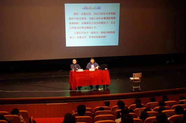 张志扬以“拒绝校园欺凌”为主题,结合实际案例,通过诙谐幽默的语言为大家讲授了一堂内容丰富、意义深刻的法制教育课。他分别从什么是校园欺凌、校园欺凌的主要表现行为、特点、危害、产生原因、如何正确应对校园欺凌、如何让欺凌远离校园等方面进行阐述。他强调,一要关心自己、善待他人,与他人友好相处,避免自己成为施暴者的目标,养成善于观察的好习惯;二要应对暴力,临危不乱,遭受语言暴力时要淡然处之,无畏回应;遭受行为暴力时要找机会逃跑,或大声呼救,如果以上措施被攻击者截断,就应尽力保护自己身体安全;三要及时报告,以法维权;四要应对暴力,必须增强守法、自我保护意识。同时,注意应对方法和策略,做到遇危智为、遇危巧为。
