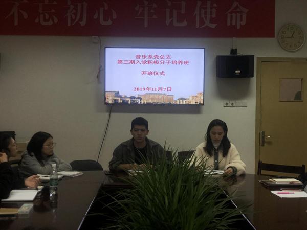 在“不忘初心、牢记使命”主题教育深入开展之际,2019年11月7日,音乐系党总支在系党员之家会议室举行第三期入党积极分子培养班开班仪式,音乐系党总支专职副书记、组织员、学生党支部党员、党务助理、第二期培养班学员代表,以及23名第三期入党积极分子参加。