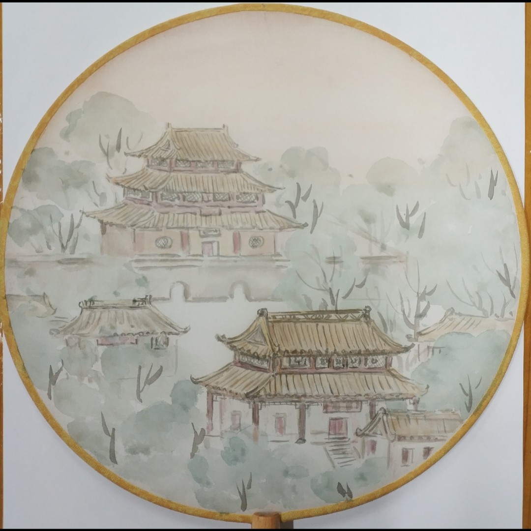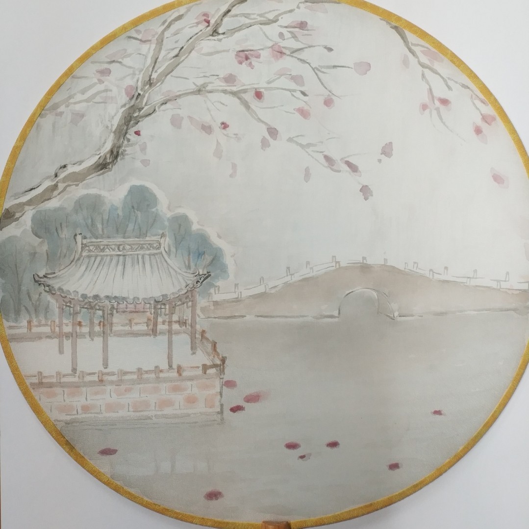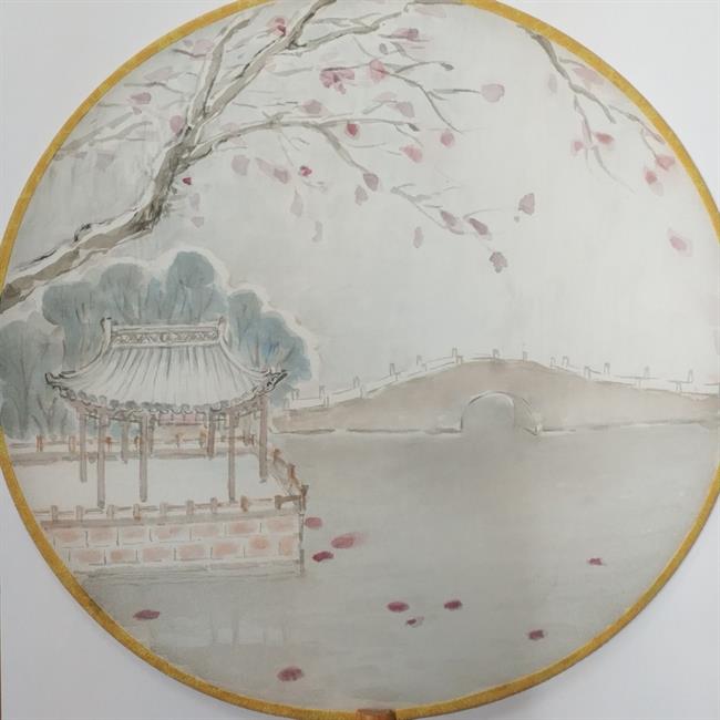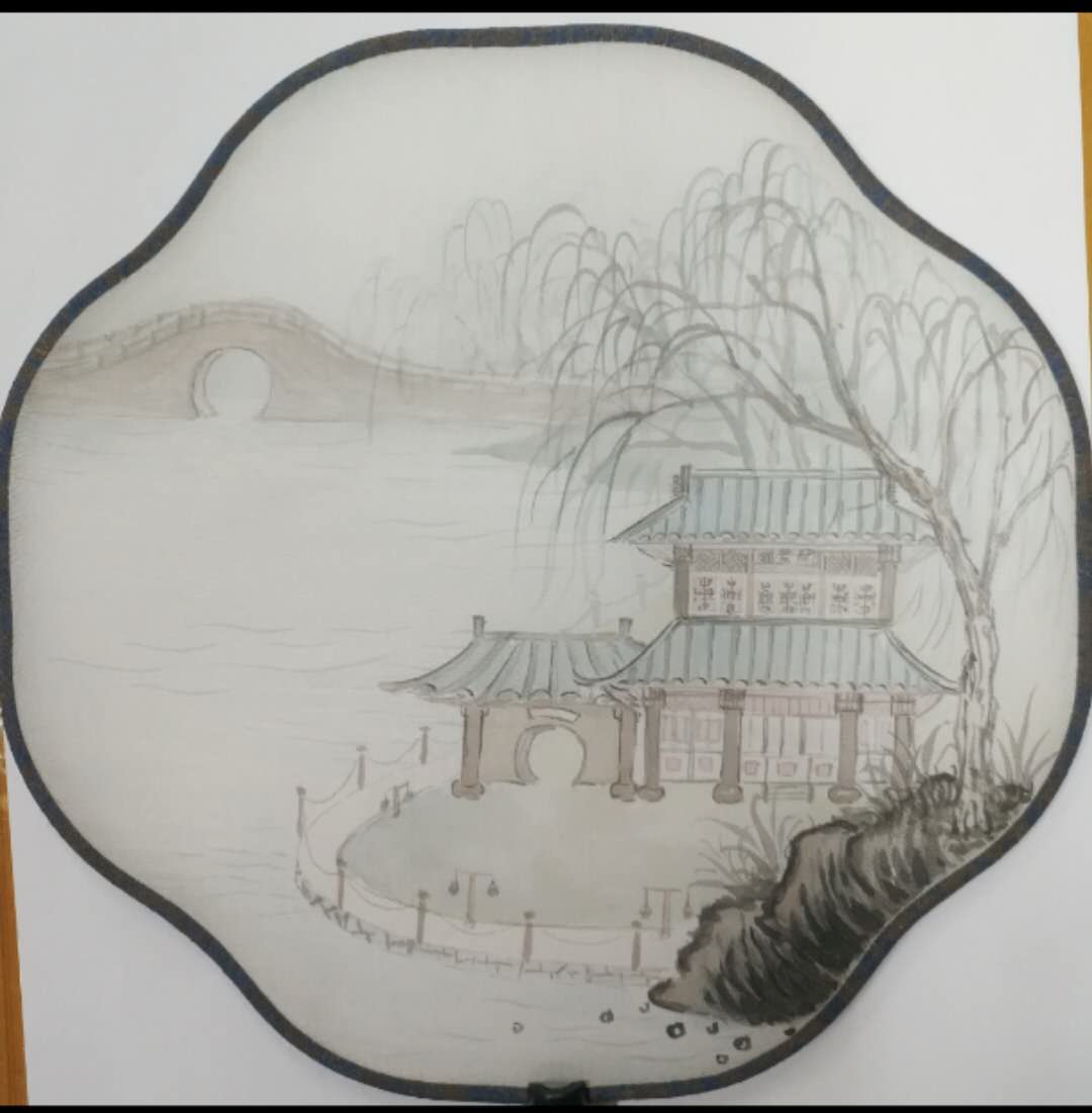 书画团扇绢画兴起于南宋宫廷画院,南宋院体的绘画手法也能诠释我们印象中西湖之美、杭州之盛。细节上,我们继续采用山水画勾勒具有杭州十二景中的亭台塔桥和狂浪静湖。