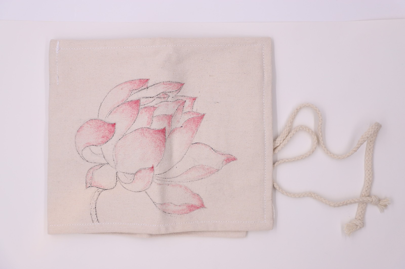 制作手绘笔袋需要提前打稿,但因为笔袋棉麻的特殊性,打稿结束后,墨水无法上色,经过多次研究我们决定用丙烯绘图,但丙烯也存在缺点,既难上色也难更改,最终效果虽没有我们原本想要的水墨感但却增加了立体感。
