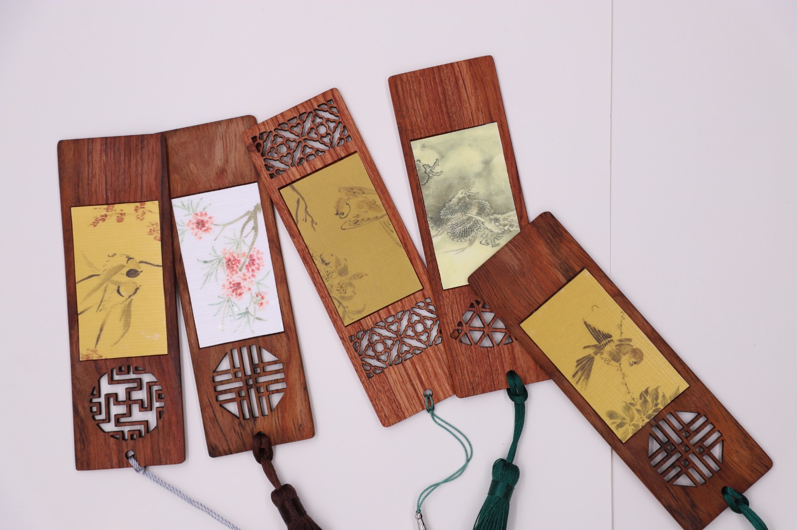 书签一直是文创产品最钟意的设计对象,这次我们尝试用成本更高的花檀木和黑檀木来制作。镂空花样以古代庭院楼阁的花样作为模板,而中间的国画样式根据杭州独特的山水风格、生态元素创作而成,将三年制所学浓缩在书签中间的一张张图画样式之中。