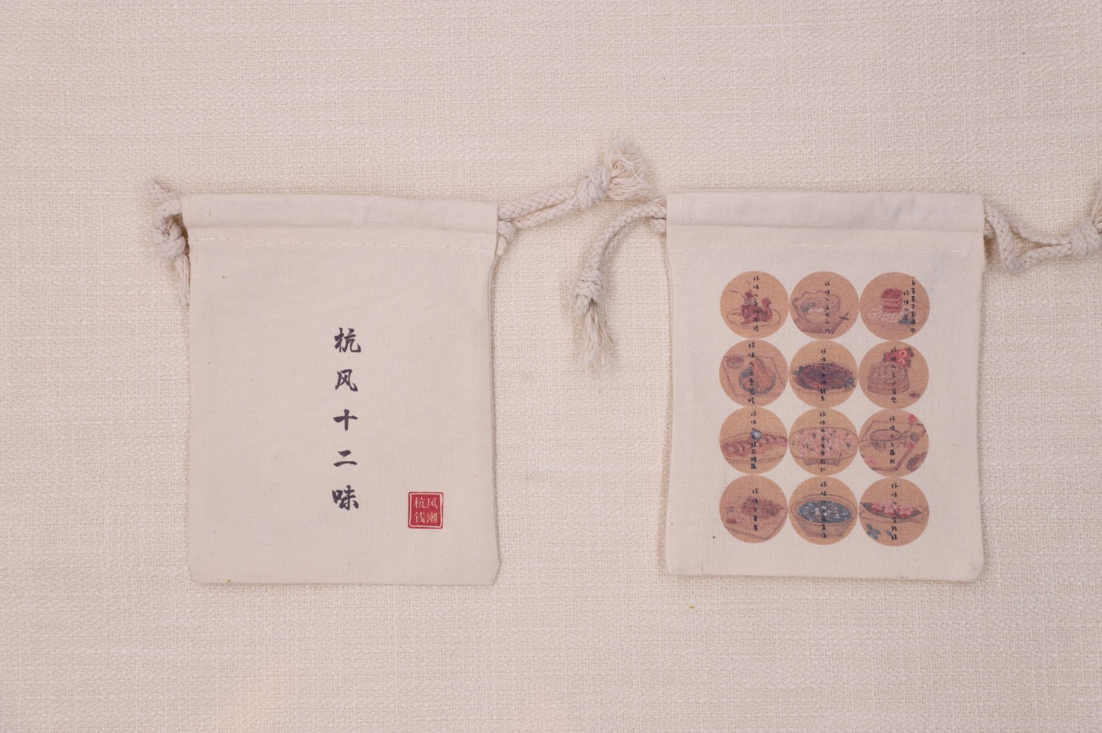 以“杭帮十二景”和“杭帮十二味”画稿为基础,制作了纸质书签、日历、小布袋等多种周边。