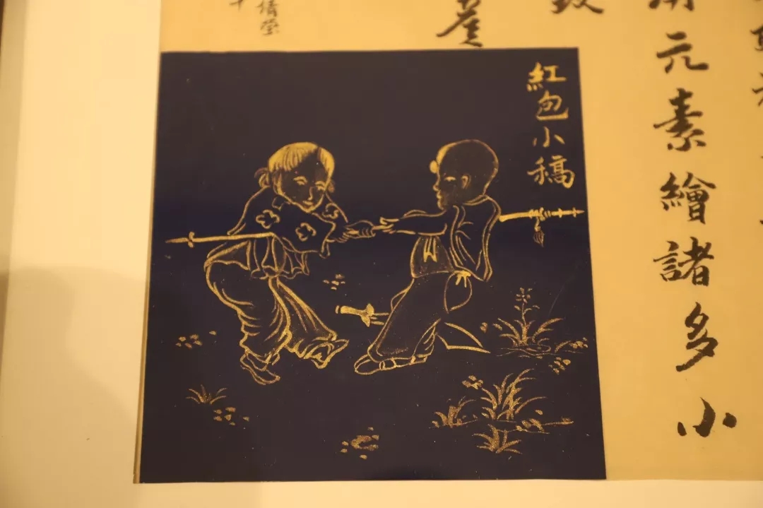 以工笔技艺作为基础,在蓝色宣纸上用金线描边,勾勒出童子像。