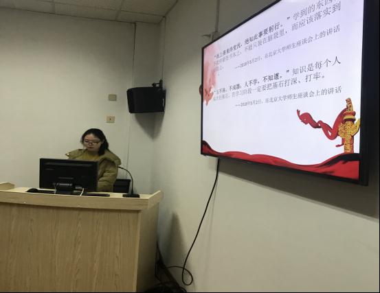 围绕“学习习总书记系列重要讲话,如何以榜样的力量推动个人成长成才”这一主题,三名入党积极分子作为宣讲人通过“音像学堂”、“重‘习’经典,平‘语’近人”、“榜样事迹”、“榜样力量推动成长”等块面讲述自己的学思悟践,讲述自己身边的故事,讲述自己的不足和未来努力方向。