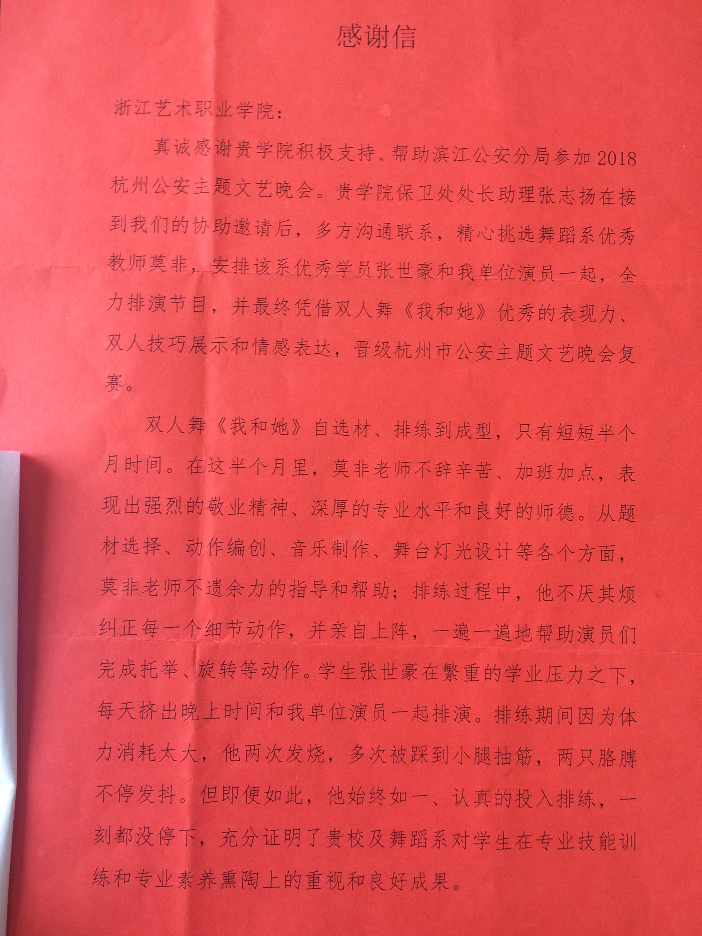 近日,我校连续收到了两封感谢信——共青团浙江省委感谢我校协作拍摄五四专题片《爱国是最燃的事》,滨江公安分局感谢我校协助排演舞蹈节目《我和她》晋级杭州市公安主题文艺晚会。浙艺师生的艺术专业水准和服务精神,得到了两家单位的高度赞扬和肯定。学校收到感谢信后,号召全校师生向他们学习,服务社会,永无止境。