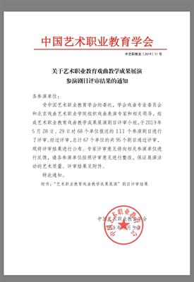 为庆祝新中国成立70周年,贯彻落实习近平新时代中国特色社会主义思想和党的十九大精神,中国艺术职业教育学会将于201911月在北京长安大戏院举行百戏百校——艺术职业教育戏曲教学成果展演”(简称“百戏百校展演”)。