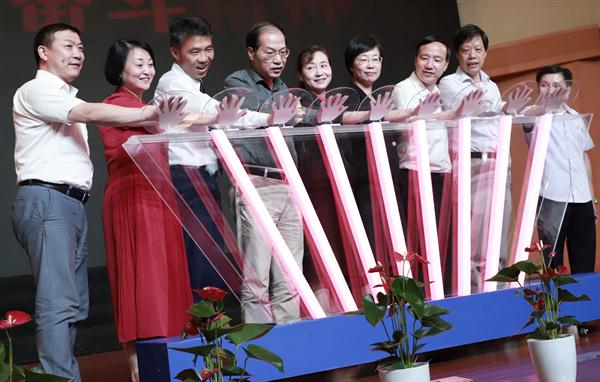 大会首先发布学校“红色文化月”品牌名称和logo,由党委组织部定义,美术系党总支报送,党员教师叶峰泉设计。校党委班子全体成员共同按下手印,启用品牌名称和logo。校党委委员、宣传部部长马向东受党委委派作了品牌logo解说,阐述了品牌logo设计理念。标志整体选择了能够全面展现我校特色的“艺”字作为主体,上半部分融入“党旗”、“长城”等元素与字体笔画结合,下半部分将“一”字与“心”字融合,展现了“艺心(一心)向党”的主旨。设计中融入我校校标优美的曲线律动,厚植“求真 尚美 精艺 修为”校训精神,秉承“心有大我、至诚报国”的爱国情怀,引领全体党员“积极作为、主动担当”。