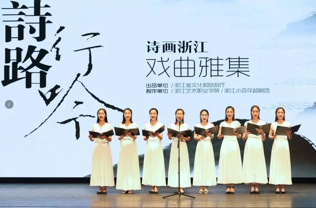 由浙艺优秀毕业生为主力组成的浙江小百花合唱团吟唱的《与君山水》,唱的是诗画浙江的千年诗情,是绿水青山的时代风景。