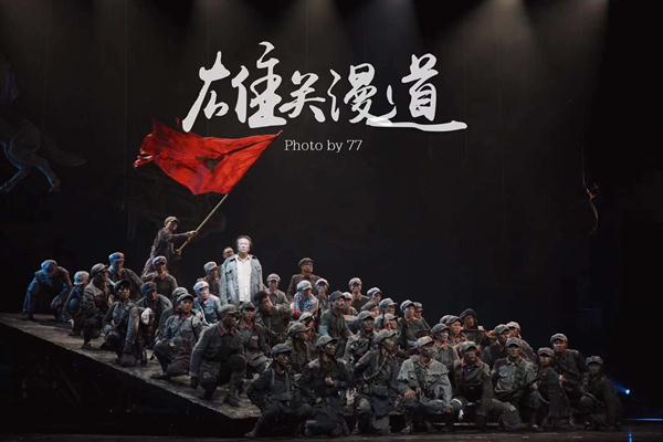 万里长征不仅给我们留下了渡湘江乌江、四渡赤水、强渡大渡河、过草地、翻雪山等一幅幅鲜活的历史画卷,更为我们留下了不朽的长征精神。《雄关漫道》的创排让我们对整个事件更有了画面感,特别到遵义会议时,经历了前面一次一次的失败、绝望,让我更加明白了这份成功来之不易。这戏很辛苦,推移平台摸爬滚打,也时不时有人带伤带病上场,长征精神是不畏艰难,不怕困苦,不怕流血牺牲的革命英雄主义精神。无论有多少艰难,我们都会以红军精神坦然面对。