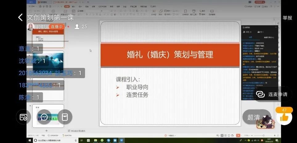 文化创意与策划专业核心课程有新媒体营销策划实务、创意学基础、文化产业概论、创意文案写作实务、新媒体策划短视频制作等。为了让学生更清楚地了解学习内容,突出学习重点,教研室老师们使用了钉钉平台在线直播、微信讲解和PPT演示等教学方式,开展线上互动教学。如短视频制作第一课结合时下疫情为主题布置学生构思制作一个短视频作业,内容为文字加图片,下次课前老师对作业进行抽取点评。