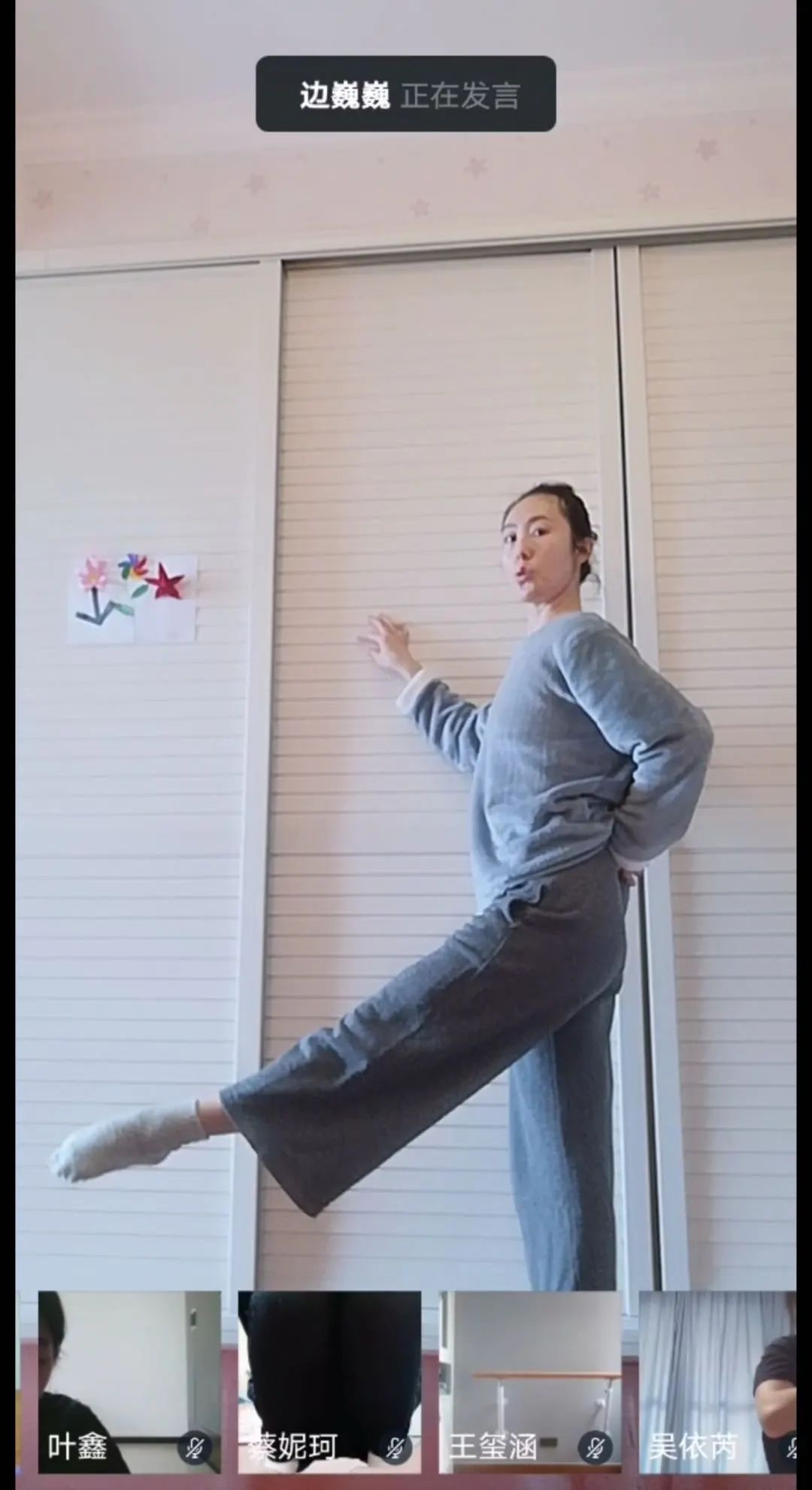 同时,这次疫情把偌大的舞蹈房困囿在了一室之内、一厅之间。与空间一起被压缩的还有平时学生们花费在路上的时间。使边巍巍能够脱开平时被课表限制的课节,直接随时查看学生们上传在云端的练习视频甚至多次倒带以发现动作里更细小的错误。隔着遥远千里抑或屏幕间的阔面半米,边巍巍网线下的指教也无半点懈怠,依旧要求学生们持之以恒。