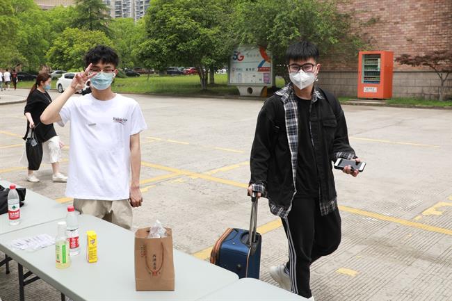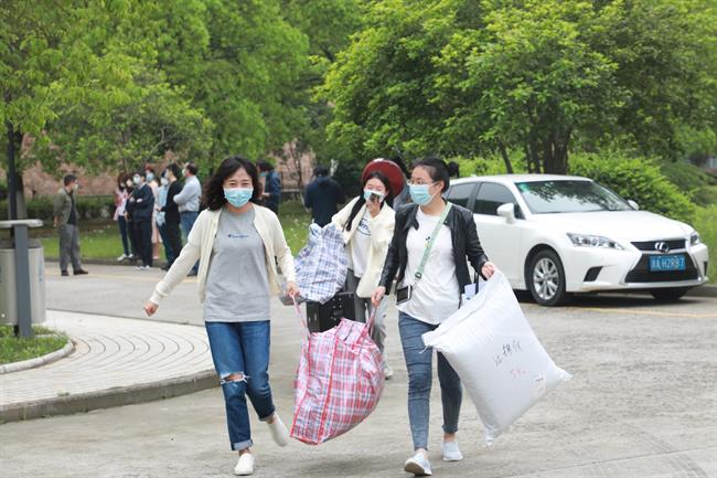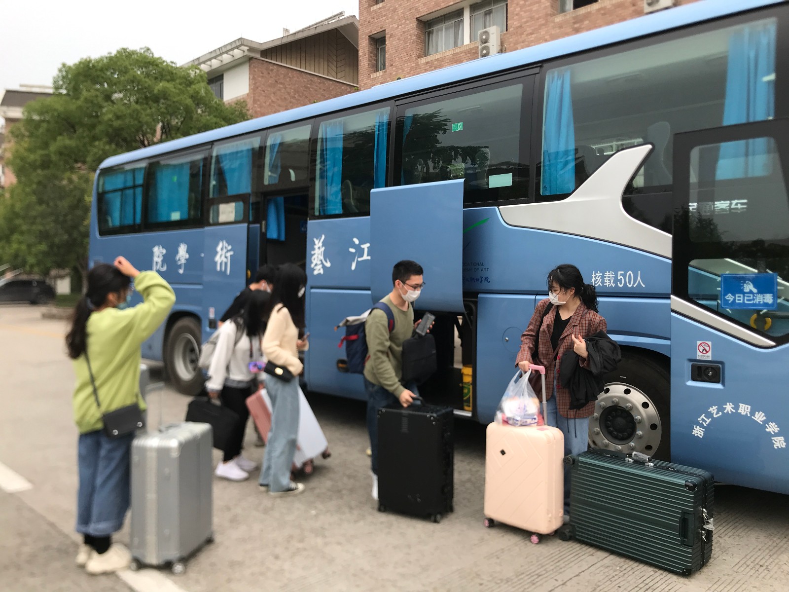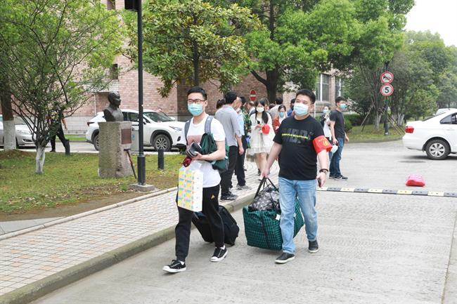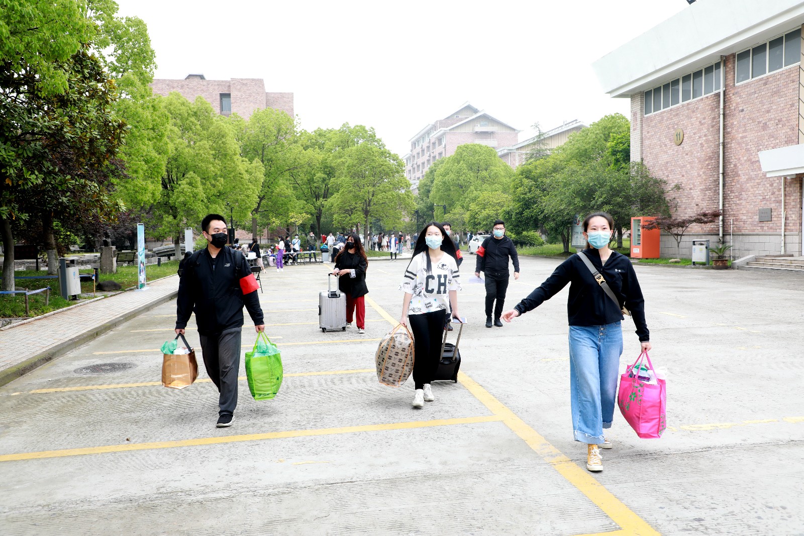下车后再次测温并进行行李消杀,老师还贴心地帮同学们搬运行李。同学们出示完“一码一证一温"(杭州绿色健康码、身份证(学生证)、体温测量筛查), 符合要求后就可以进入公寓。
