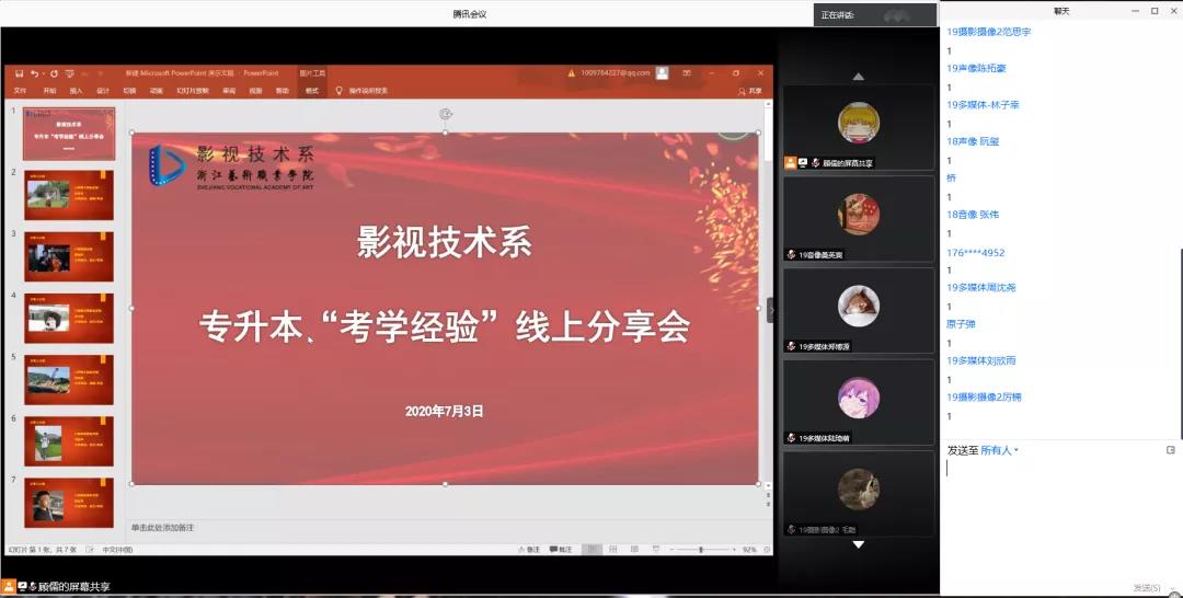 7月3日,影视技术系开展专升本“考学经验”线上分享会。本次分享会邀请了6名影视技术系2020届成功升学的校友进行线上的专升本经验分享,系部92名学生参与了此次活动。分享会由“考学经验分享”“考学线上问答”两大环节组成。