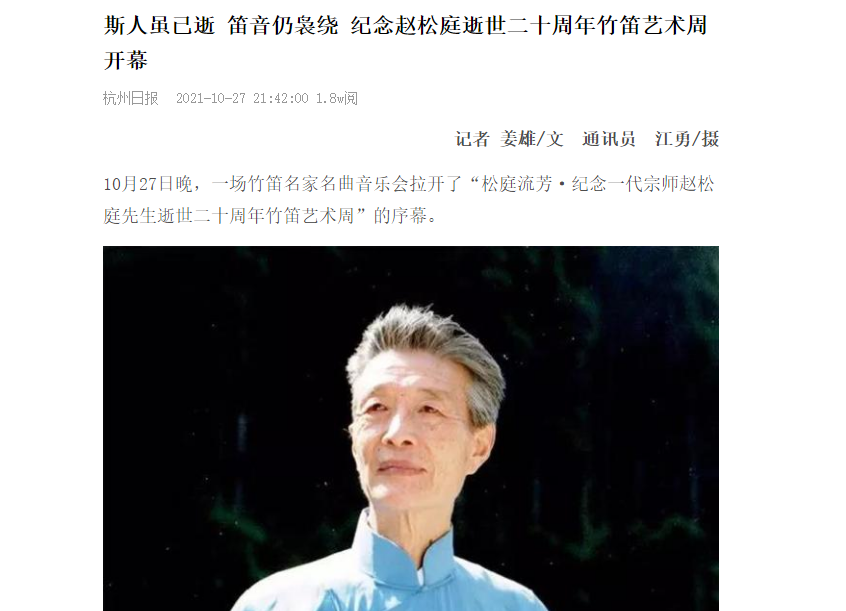 杭州日报:斯人虽已逝 笛音仍袅绕 纪念赵松庭逝世二十周年竹笛艺术周开幕