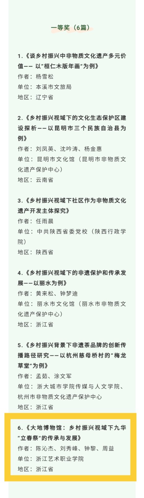 此次征文活动是第六届“大匠至心”非遗传承发展杭州沙龙的重要环节。活动面向全国征稿,从事非物质文化遗产保护、传承与发展研究、乡村振兴实践研究的单位和个人,均可投稿。近日,该活动落下帷幕,主办方共收到来自全国15个省市自治区80篇论文,经专家评审委员会认真评审,共评出获奖论文33篇。其中一等奖6篇,二等奖11篇,三等奖16篇。我校教师陈沁杰、刘秀峰、钟黎、周益撰写的《大地博物馆:乡村振兴视域下九华“立春祭”的传承与发展》获得征文一等奖,并受邀参加第六届“大匠至心·非遗传承发展杭州沙龙”。