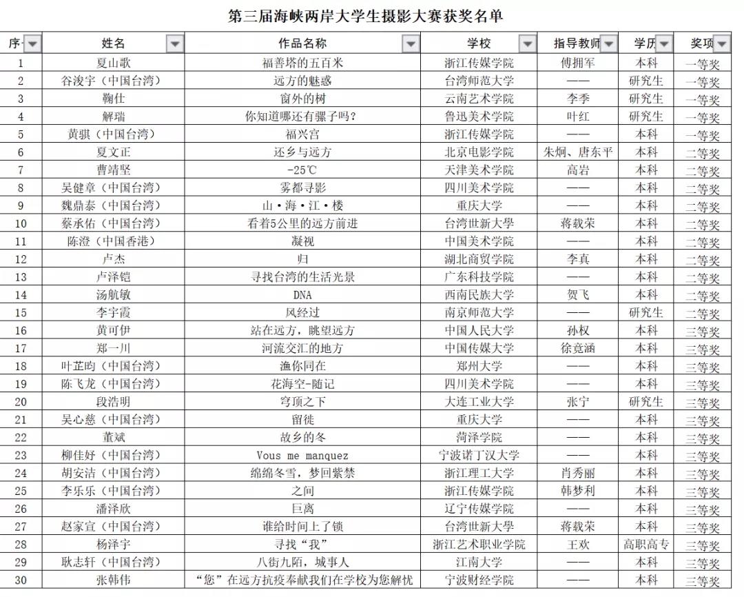 我校影视技术系19摄影摄像1班杨泽宇为本次大赛唯一高职高专生荣获本次摄影大赛三等奖,获奖作品《寻找“我》,指导老师王欢。同时,第三届海峡两岸大学生摄影大赛暨第二届海峡两岸大学生短视频大赛获奖名单揭晓,影视技术系学子创作的短片《童年有记》荣获优秀奖,由编导教师团队汤海滨、刘慧、芦辰芳等指导。