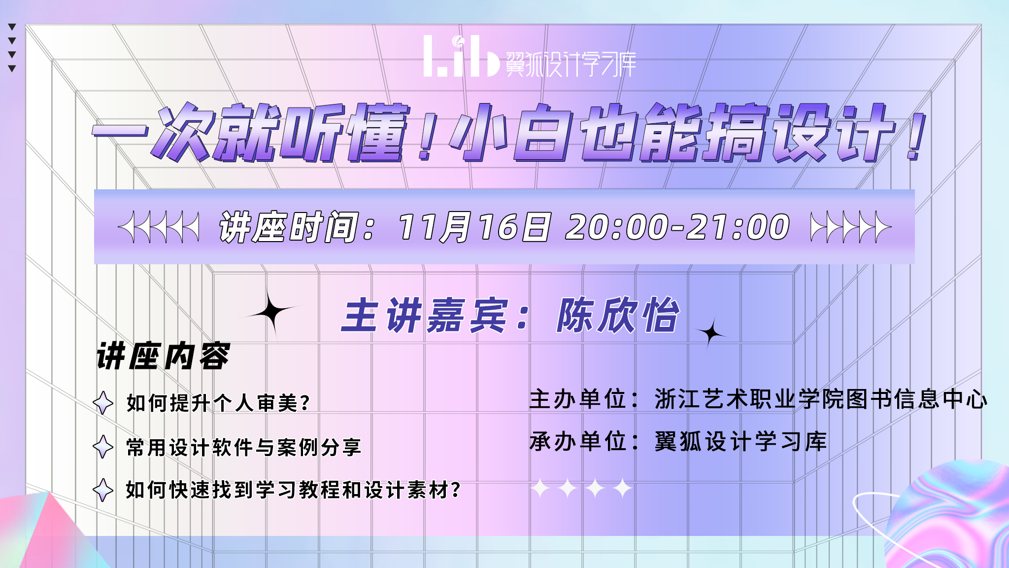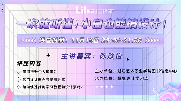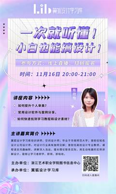 因此,图书信息中心联合翼狐设计学习库,特别为我校师生提供一场以“翼狐设计学习库——规划最全面的设计知识地图”为核心的直播讲座,让读者了解设计最前沿的行业资讯及动态,意识到学习设计的重要性,领会设计的魅力,教你如何使用翼狐设计学习库——10年创新设计教育经验倾力打造的艺术设计资源库寻找自己感兴趣的设计综合教程,提升自我软实力,从而体会设计的乐趣,懂设计、会设计、爱设计,获取更多最前沿、最实用的设计资讯,掌握更多能对学习、生活和未来工作都有大用途的设计技能。