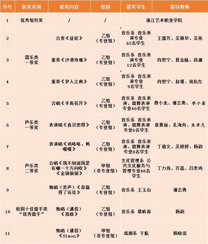 据悉,浙江省大学生艺术节是我省高等学校艺术教育成果集中展示的“重要窗口”,本届大学生艺术节历时七个月,共吸引全省5000余名师生共同演绎了富有思想性、艺术性、时代性的精品力作,97所高校选送声乐、器乐和十佳歌手等类别的节目共556个参加本次艺术节活动,评选出170个节目进入现场展演。进入最终展演的器乐类节目50个,其中甲组35个,乙组15个;声乐类节目60个,其中甲组44个,乙组16个;十佳歌手60个,其中甲组40个,乙组20个。