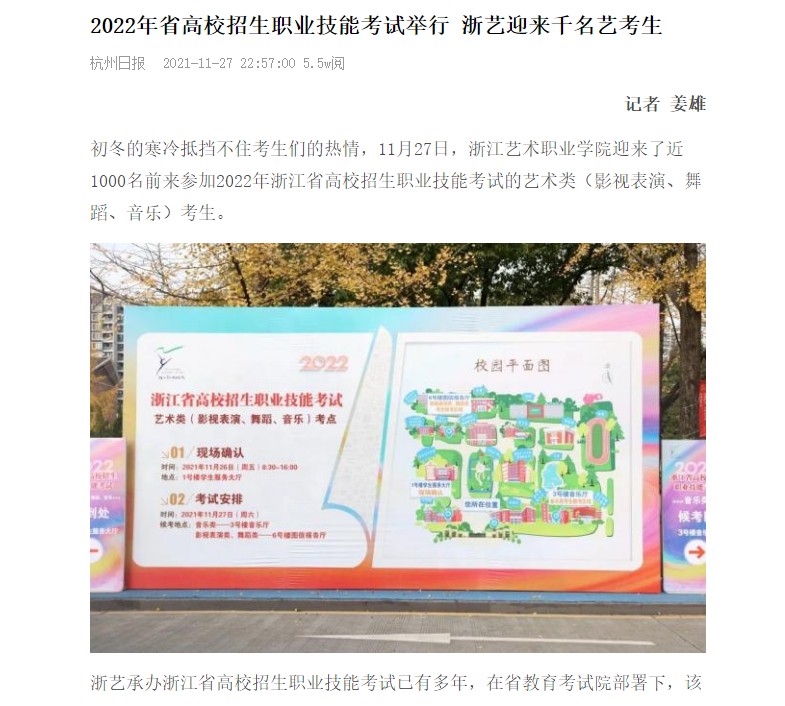 杭州日报:2022年省高校招生职业技能考试举行 浙艺迎来千名艺考生