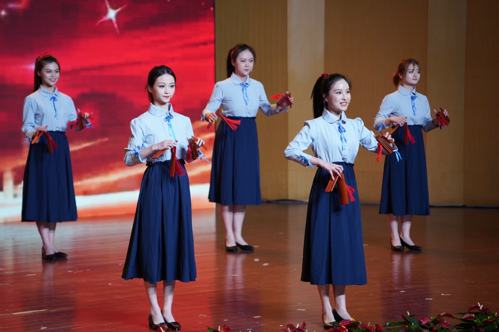 演出在激情洋溢的歌舞《我们年轻人》中拉开序幕,整台晚会分“惜取少年时”“花开正当时”“未来创造时”三幕,快板《祖国颂》、器乐合奏《春到湘江》、独唱《把一切献给党》等13个节目富有感染力,不仅点燃了在场观众的热情,也让大家感受到同学们对基层文化事业的热爱和成为一名基层文化员的信心与决心。