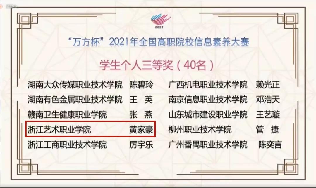 近日,“万方杯”2021年全国高职院校信息素养大赛落幕,我校文化管理系20文物修复班学生黄家豪在全国高职院校信息素养大赛中荣获全国三等奖,这是我校学生近年来首次在全国性信息素养类大赛中获奖。
