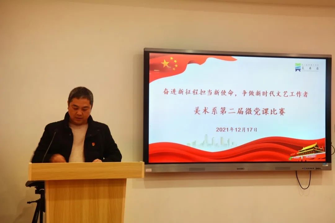 12月17日,美术系学生党支部开展“奋进新征程担当新使命  争做新时代文艺工作者”第二届主题微党课比赛。此前,来自第38期党校学员的10名同学,经过系部初赛选拔后,共有5名同学脱颖而出参加本次微党课决赛。美术系组织员章彪、学生党支部书记龚林峰、团总支副书记朱丹丹出席并担任比赛评委。全体学生党员、入党积极分子代表、青年理论学习小组成员代表等现场观摩学习。