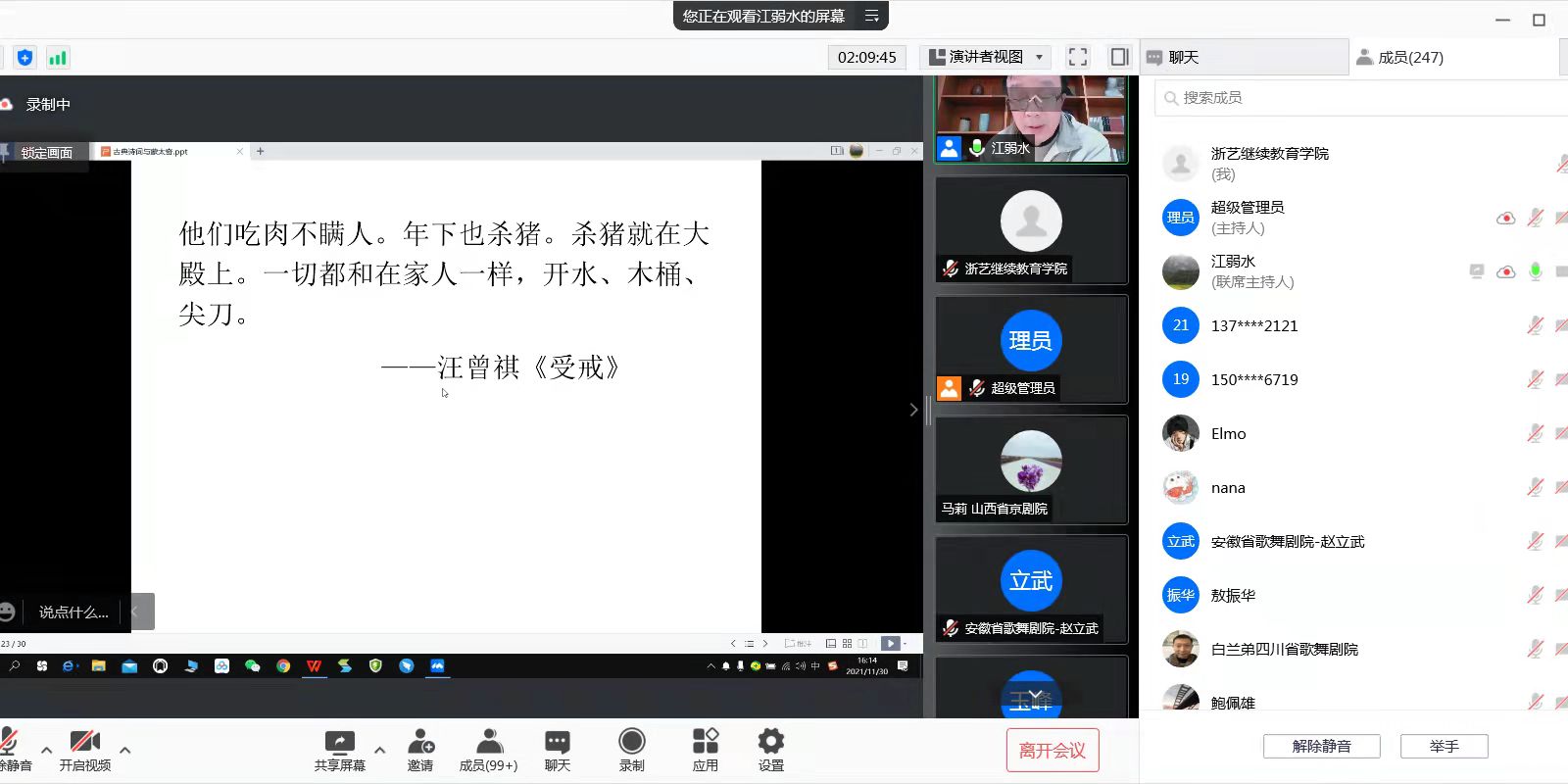 培训从新时代对舞台美术发展的要求作为中心点和切入口,进入新形势下舞台美术行业前沿理念、发展趋势、创新思路、设计艺术等的学习、思考和讨论,学员们的培训感受非常丰富生动。虽然参训的学员们是在云端相聚在课堂,但大家的学习和交流的热情,丝毫没有因为学习方式的改变而减弱,纷纷表示此次培训学习层次高、内容丰富、体会深刻。学员黑龙江省龙江剧艺术中心李小乐说:“作为长期在基层文化战线的工作人员,能被黑龙江省文旅厅选派学习,深感荣幸。我觉得本次培训班的授课老师层次很高,课程内容涵盖非常全面。在培训中,我充分提高了认识、开阔了眼界、强化了素质,得到了很有效的交流,也让我深知自己肩负的使命与责任,要更全身心地投入到这项立心铸魂的高尚工作之中。这是一次珍贵的云端学习之旅。”