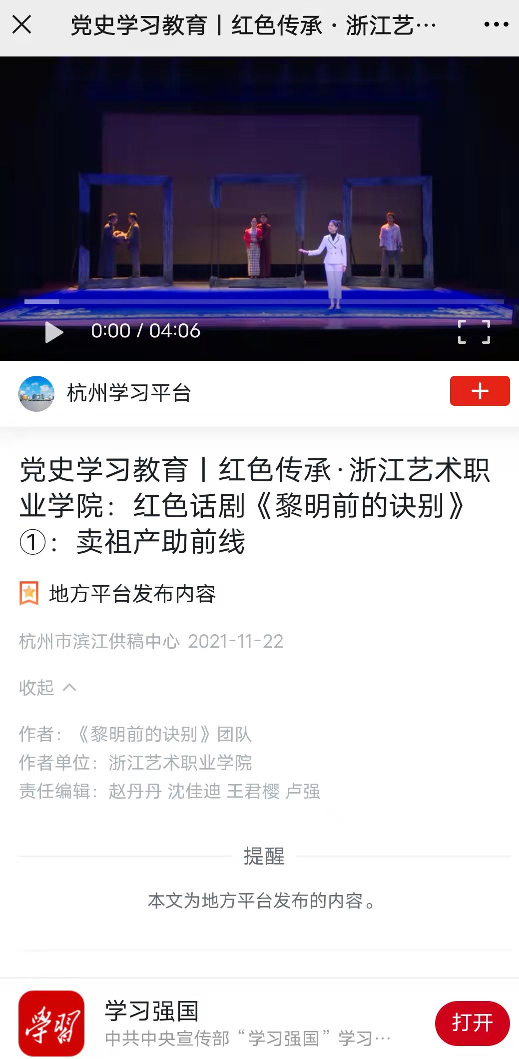创排期间,戏剧系组织师生赴海盐参观朱聚生纪念馆,进行红色文化教育,追寻先烈足迹,感受烈士的革命精神;在武原街道、沈荡老镇进行文艺演出,展现浙艺学子艺术风采。沈荡镇宣传委员姚敏方说:“推出情景剧《黎明前的诀别》,是想通过讲述朱聚生革命烈士短暂而又伟大的一生向观众展现他一生求索、奋斗不息的精神,赓续红色根脉,传承红色基因,献礼建党百年。”