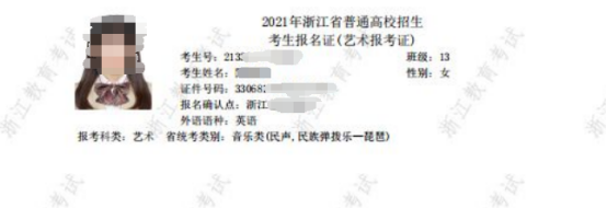 22021浙江省普通高校招生考生报名证艺术报考证》复印件。