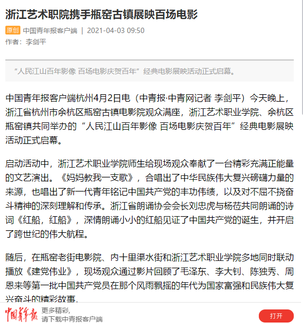 中国青年报客户端:浙江艺术职院携手瓶窑古镇展映百场电影