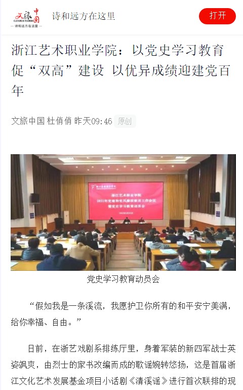 浙艺各专业院系充分调动师生们的积极性、主动性,打造多种多样的党史课堂,使党史学习教育在全院蓬勃开展,读书会、朗诵、表演等轮番上阵,因其形式多样、内容丰富而深受师生喜爱,立德树人通过这些活动真正实现了润物无声、育人无形。