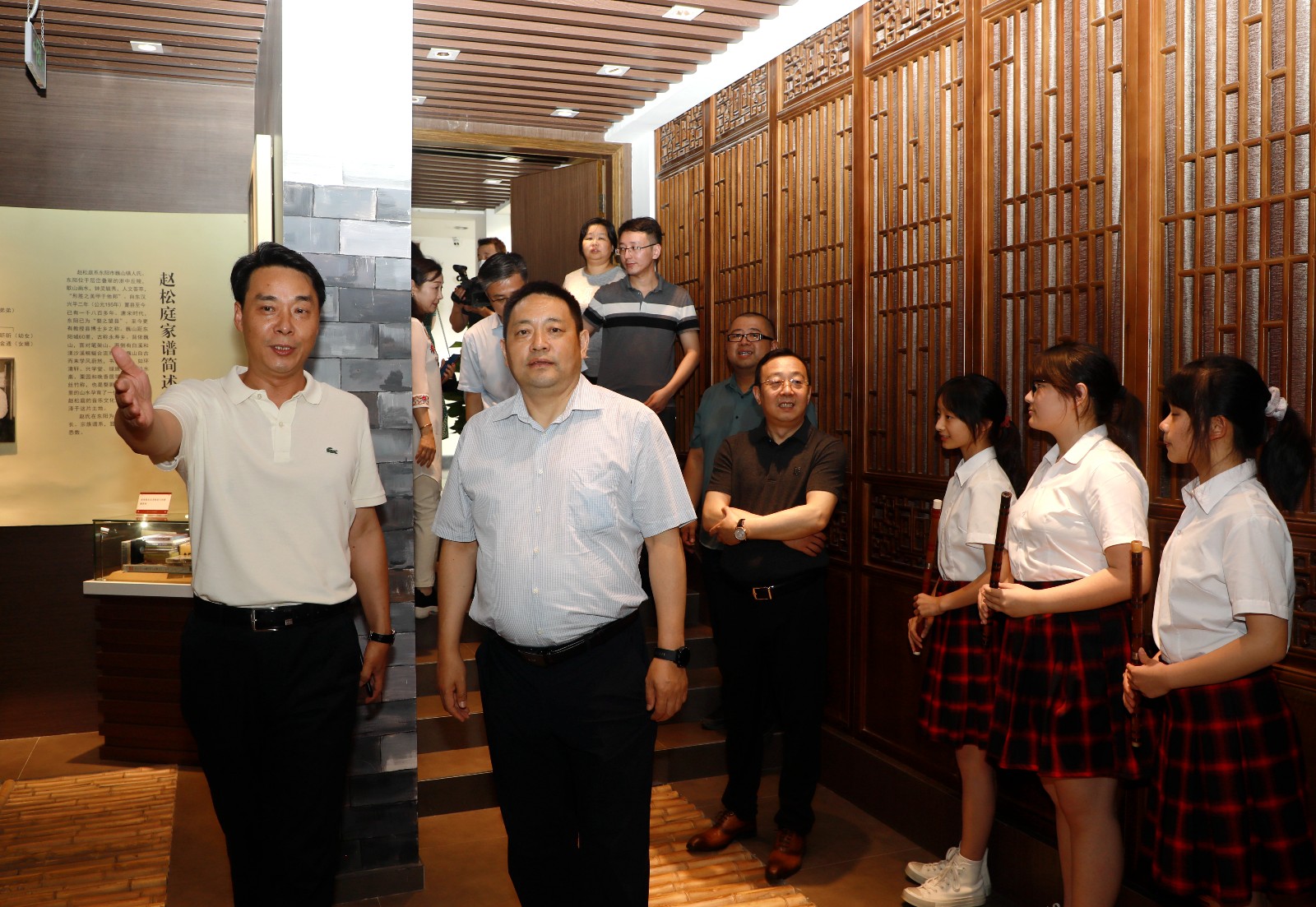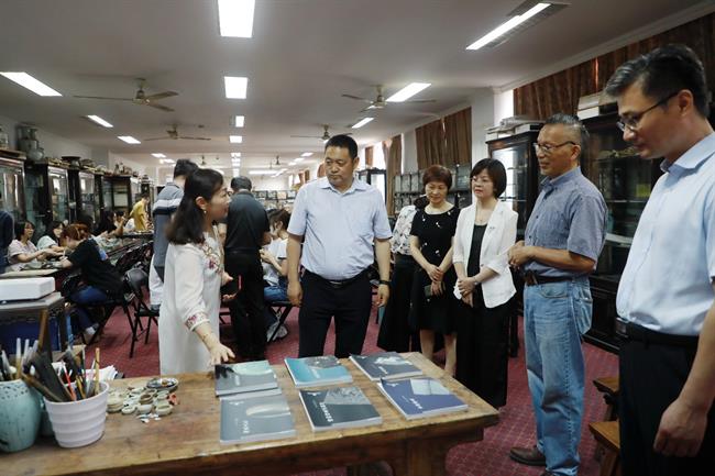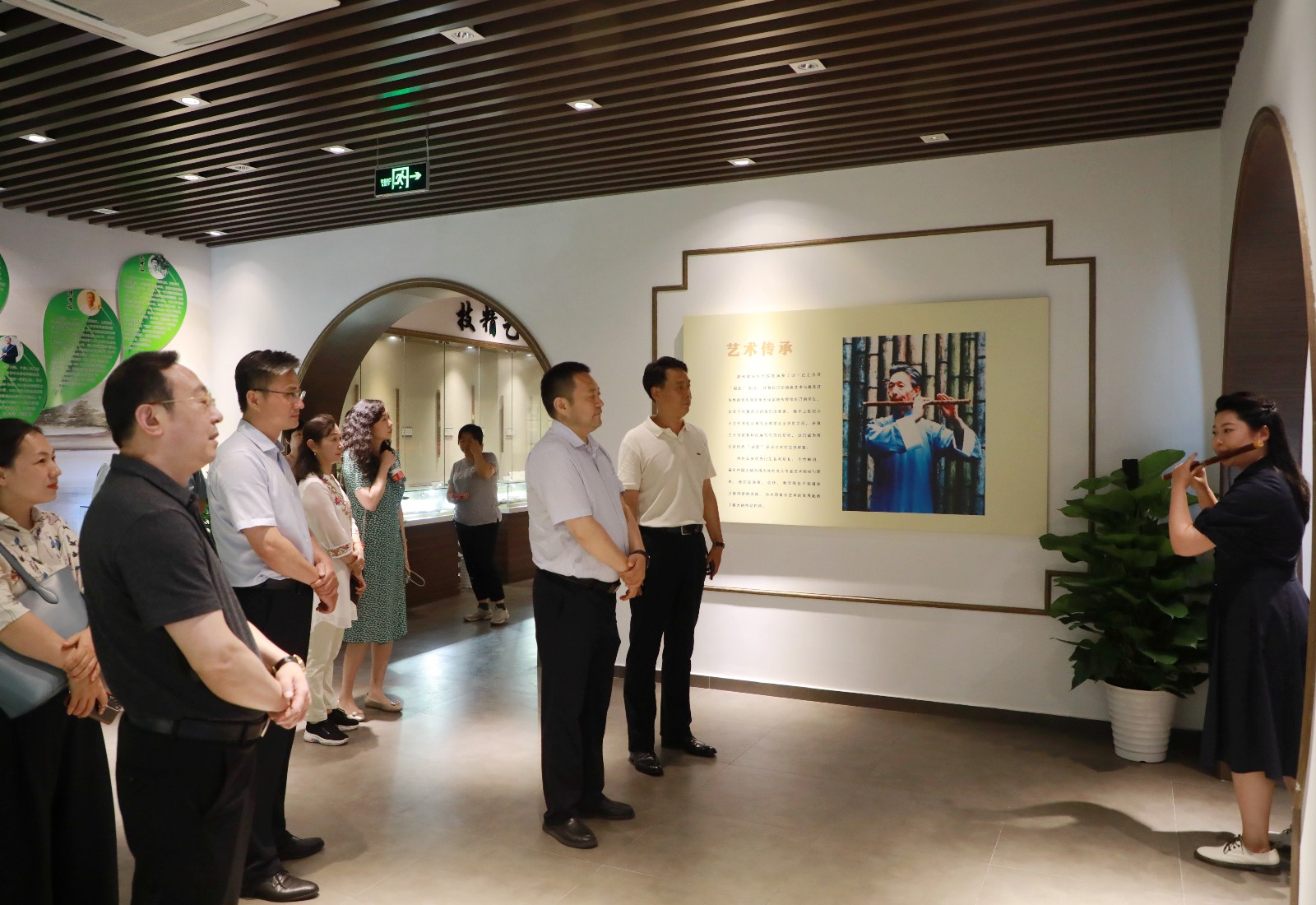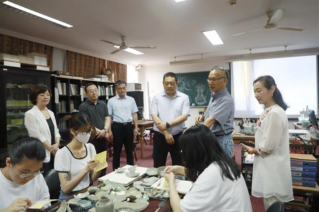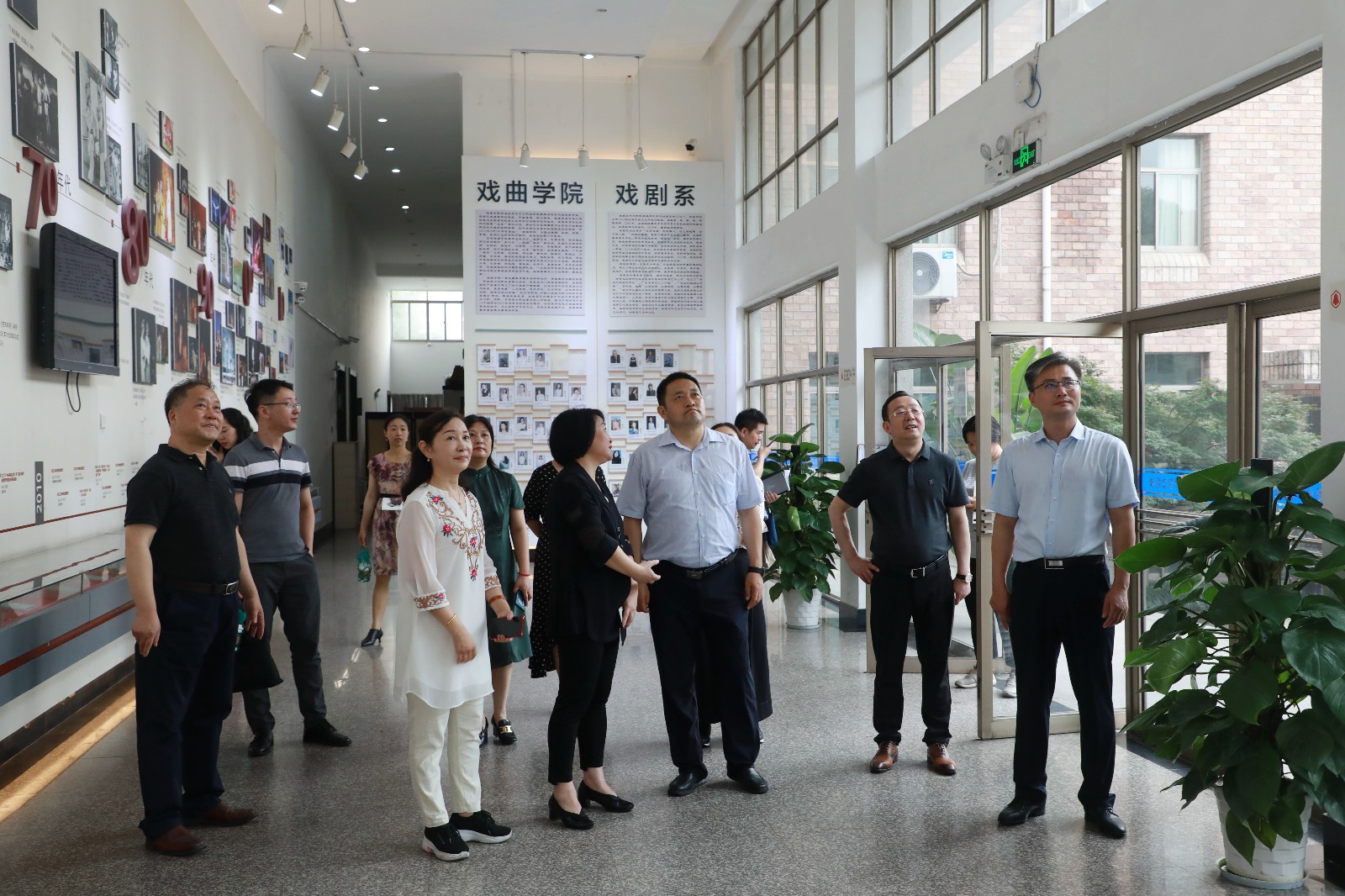 嘎玛泽登一行参观了竹笛艺术大师赵松庭纪念馆,文物修复、字画装裱、青瓷烧造、古陶瓷修复等全国非遗传承人群研修研习培训基地,黑匣子演播厅等戏剧影视与舞台美术实训基地。在美术系展厅观看“艺心向党 礼赞百年”——庆祝中国共产党成立100周年主题展。调研一行走进浙艺课堂,观看浙江省高水平专业群舞蹈表演专业、国家“双高”专业群戏曲表演专业、浙江省重点优势专业音乐表演专业“江南丝竹”器乐演奏课堂等授课情况,并就有关教学及实践情况进行了交流。参观浙江实验艺术剧场内影视技术系“时代院线”实践基地后,嘎玛泽登一行在剧场观看了浙艺正在彩排的“艺心向党”庆祝中国共产党成立100周年专场演出。