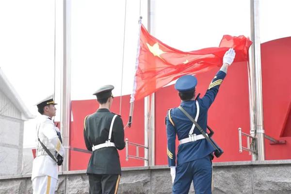 灿烂朝阳下,仪仗队迈着坚定有力的步伐穿过广场走向升旗台,雄壮的国歌声中,戏曲学院师们整齐肃立,注视着五星红旗的冉冉升起,飘扬在浙艺美丽的校园上空。