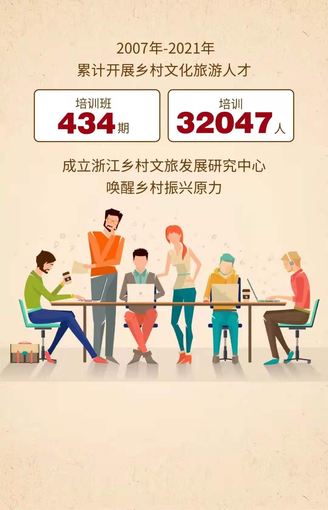 浙江乡村文旅发展研究中心2007年-2021年累计开展乡村文化旅游人才培训班434期,培训32047人,基层培训反哺人才培养,从浙江到全国输出新模式,集“科学研究、开发设计、应用服务”于一体,成为浙江乡村文旅发展研究中心唤醒乡村振兴原力,打造乡村文旅队伍的“浙江样本”。浙江乡村文旅发展研究中心被文化和旅游部授予四个“国字号”培训基地,连续三年培训工作评价考核获优秀等级,多次被省委宣传部领导批示表扬,中央、省级主流媒体广泛宣传报道。