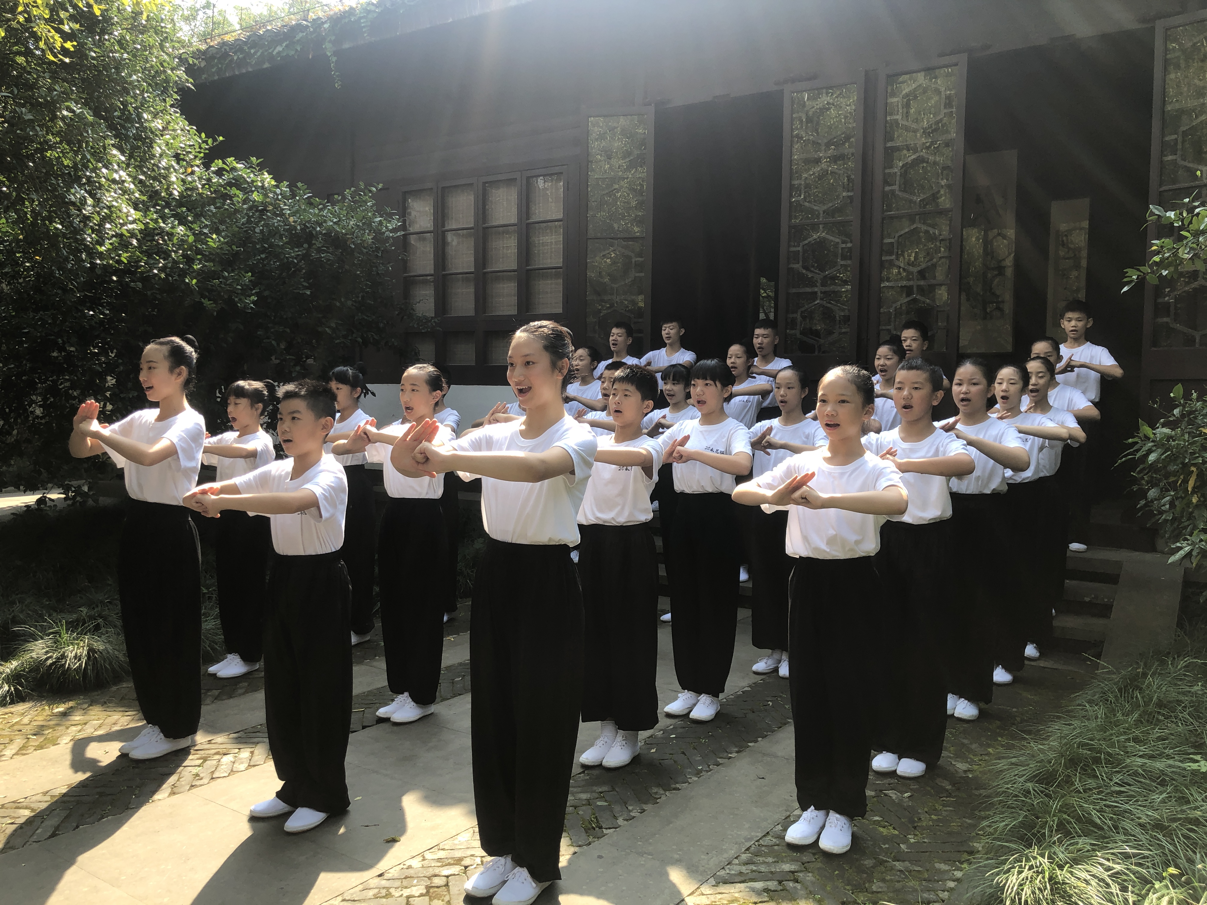 2020年10月11日,戏曲学院2020级永嘉昆剧班“初心照我心”开学第一课在盖叫天故居举行,34名白衣少年寻访梨园名家、曾在学校任教的前师先贤——京剧表演艺术家盖叫天故居。盖叫天杰出的艺术成就来源于日复一日的勤学苦练,虽曾断臂折腿而始终坚持不懈练功习艺。盖老故居庭院里,迎面就立着盖老手持剑,单腿站立,眼观远方的铜像,学子们向梨园宗师致敬,向在场的老师们行“三拜”礼,立志在学艺道路上勤勉精进。在“山映斜阳天接水”的秋日,在浙艺校歌《梦想开始的地方》的旋律中,昆曲又有了新一代传承者,34颗跃动的心,为传承,出发。