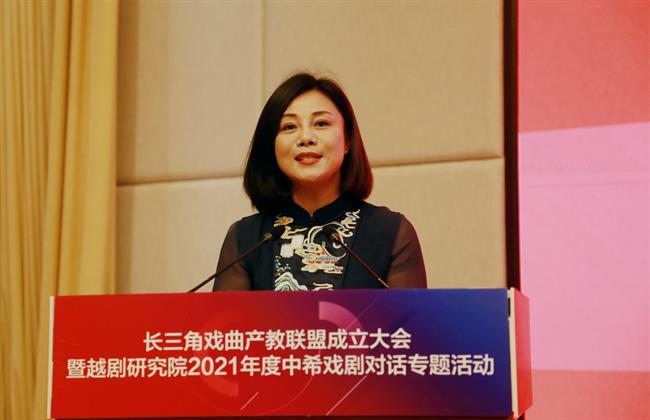 上海越剧院院长梁弘钧代表长三角戏曲产教联盟发起单位致辞。他表示,联盟的成立意味着长三角地区戏曲的发展多了一个坚实广阔的平台,借着这个平台互通有无,互相帮助,从而满怀信心地向新的目标进发。相信在产教联盟的平台上,所有戏曲院校、研究机构、院团和剧场、企业都能够相互激发、碰撞出新的火花,切实推动长三角戏曲的大发展。南通艺术剧院副院长范晓萍代表新加入长三角戏曲产教联盟单位致辞,她说,通过此次活动的开展,对于长三角地区戏曲人才培养、戏曲力量的汇聚、戏曲产教一体化深度融合协同发展,乃至未来戏曲事业的繁荣兴盛,都有着十分重要的意义。