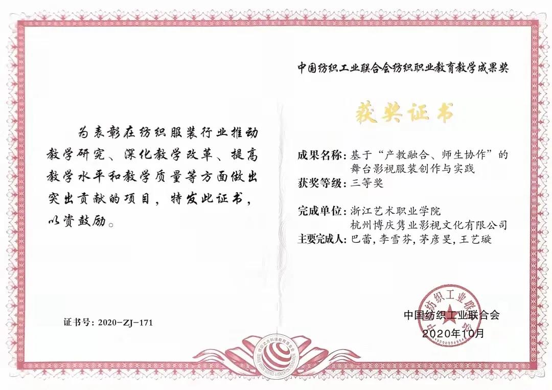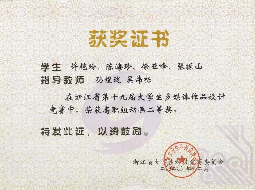 参加浙江省第十九届大学生多媒体作品设计竞赛荣获1个二等奖,2个三等奖。参加“纺织之光”2020年度中国纺织工业联合会纺织职业教育教学成果奖获三等奖。海报作品《致敬逆行者》荣获浙江省高校“寻找身边的感动”十佳书画作品奖。
