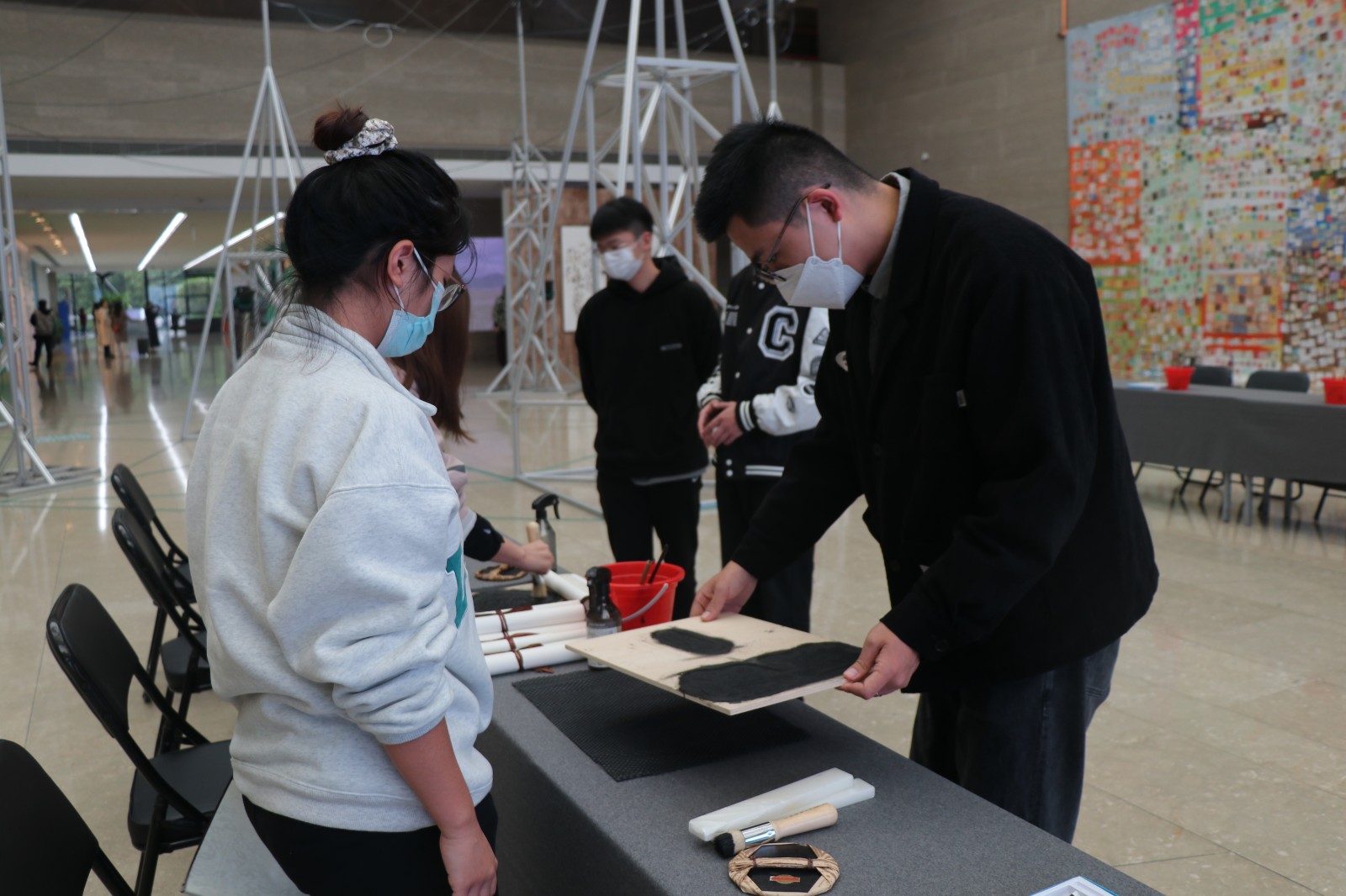 体验者们积极踊跃、依次有序体验做水印木刻,手工艺学院师生一对一、手把手指导。体验者们用心、大胆地创作,运用了更多色调让画面更厚实,让空白的宣纸变化出精彩的视觉效果。最终的成品画面丰富,独具韵味。富有趣味的体验活动,让体验者们久久不肯离去。