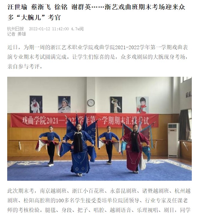 杭州日报:汪世瑜 蔡浙飞 徐铭 谢群英……浙艺戏曲班期末考场迎来众多“大腕儿”考官